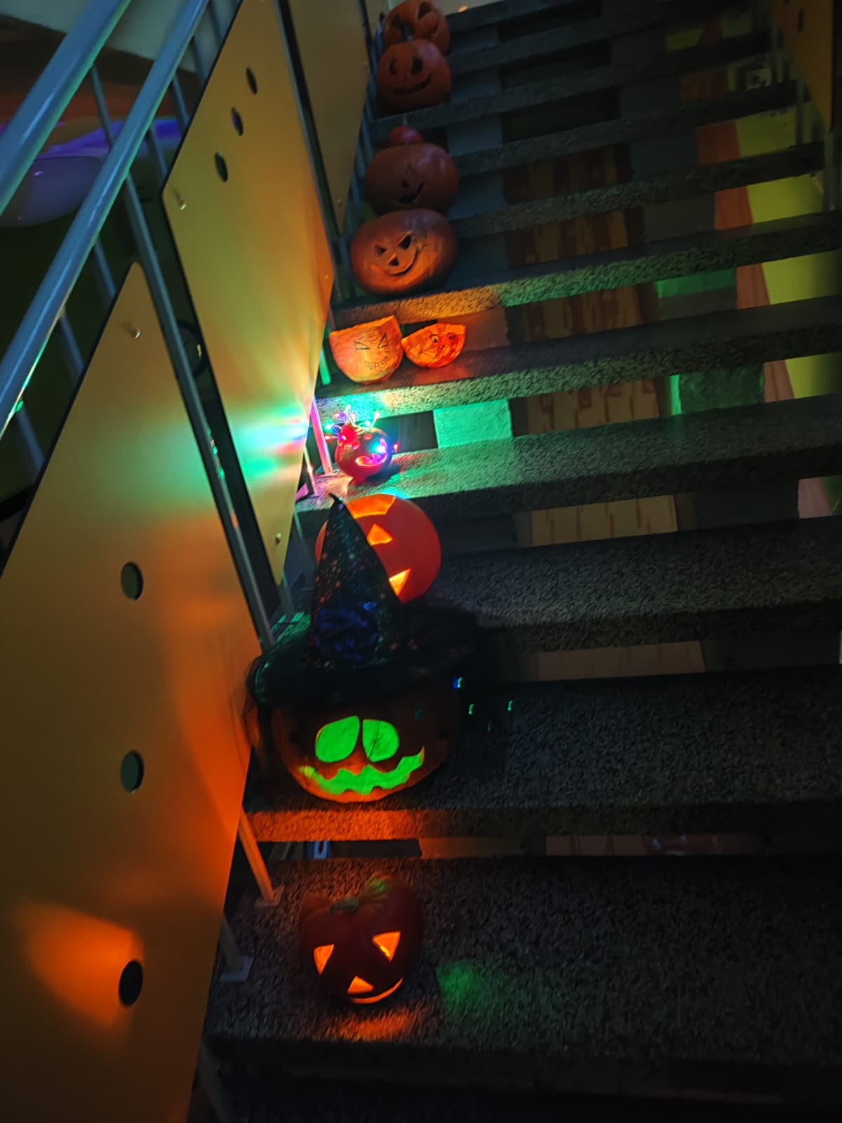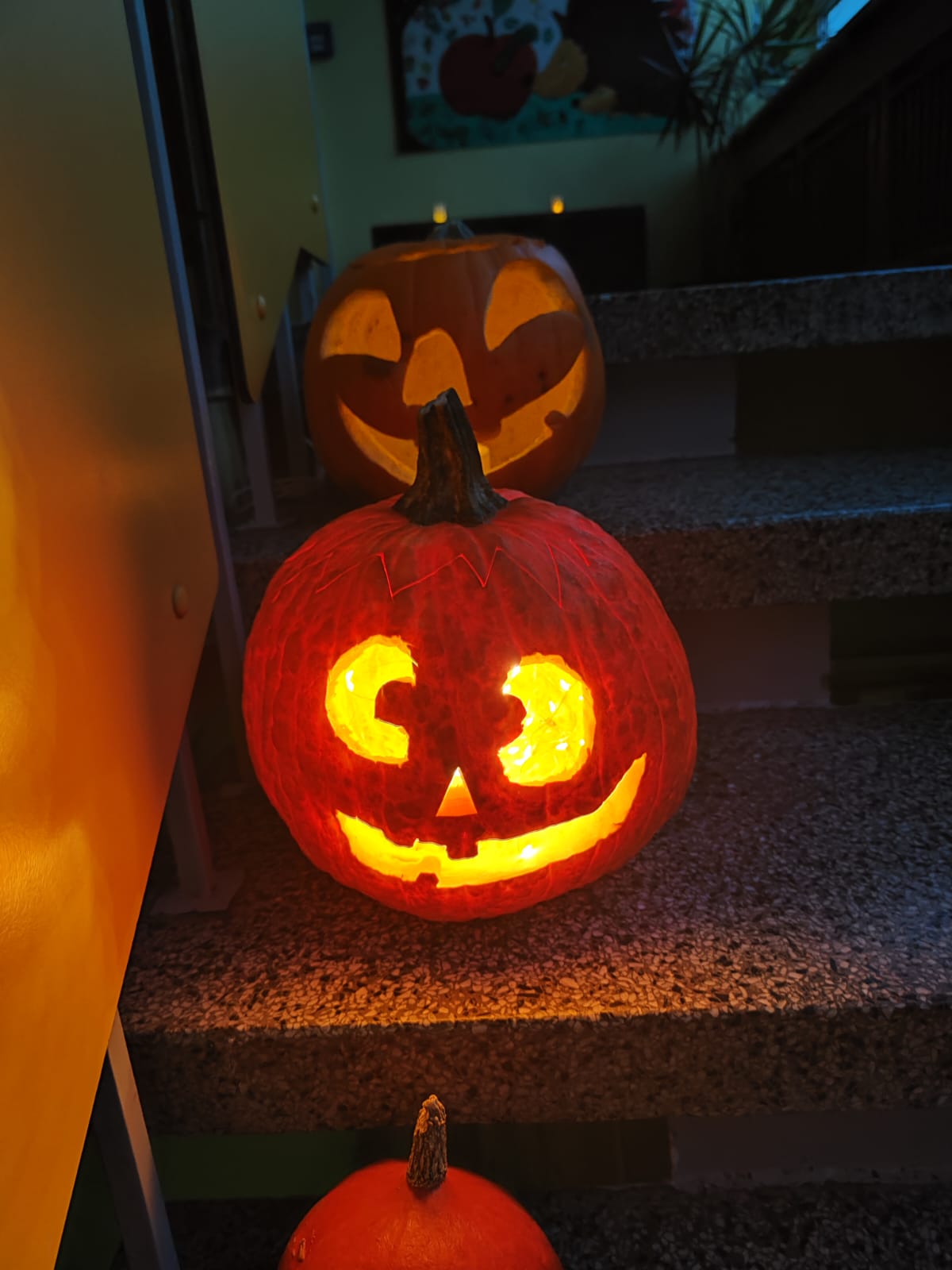 Gemeinsam mit ihren Familien haben unsere Kita-Kinder zu Hause Kürbisse geschnitzt. Diese haben wir dann im Treppenhaus unserer Kita ausgestellt. Was für eine tolle Stimmung!