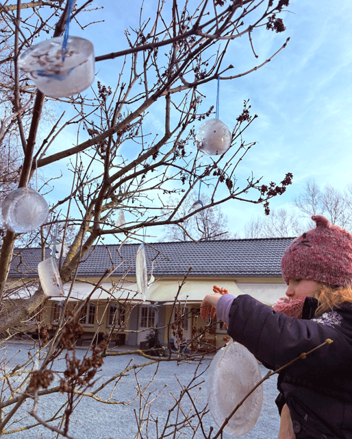 Wir sind bei jedem Wetter in unserem wunderschönen Erlebnisgarten. An einem Tag haben wir mit Wasser und der Kälte experimentiert und die Ergebnisse an unseren Baum gehängt. Wir finden es toll!