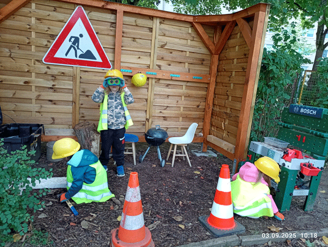 Die Kinder der Schneewittchen-Gruppe unserer Kita Märchenland werkelten als kleine Bauarbeiter auf unserer Kinder-Baustelle im Garten.