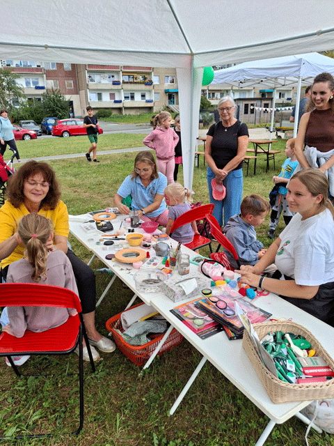 Ende August fand das jährliche „Chrieschwitz spielt“-Fest statt. Am Stand unserer Kita konnte man sich schminken lassen und mit Haarkreide Strähnchen ins Haar bekommen. Unser Stand erfreute sich großer Beliebtheit und das auch generationsübergreifend.