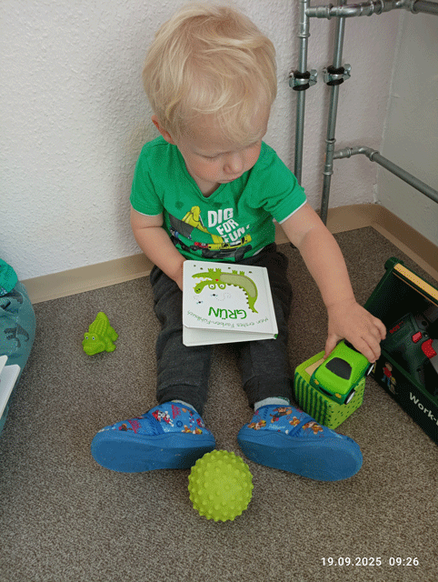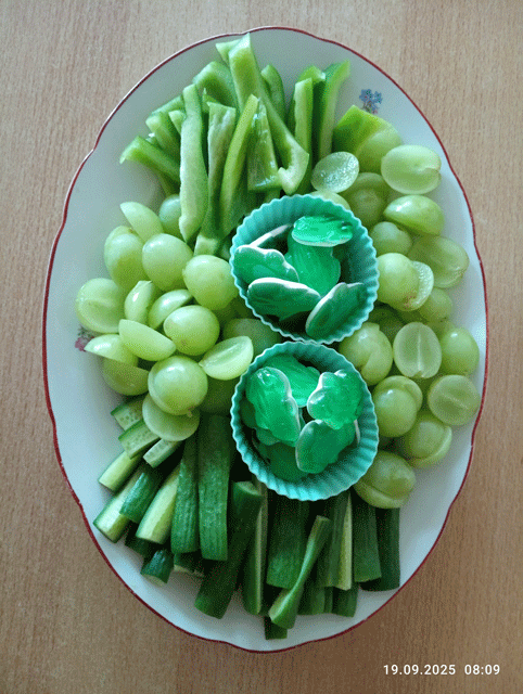 Unsere Krippengruppe „Die 7 Geißlein“ macht gerade ein Farbenprojekt. In der einen Woche war grün dran. Die Kinder hatten grüne T-Shirts an und haben grüne Dinge gebastelt. Frau Brettschneider, eine Mutti aus der Gruppe, hat sogar einen Teller mit grünen Naschereien mitgebracht.