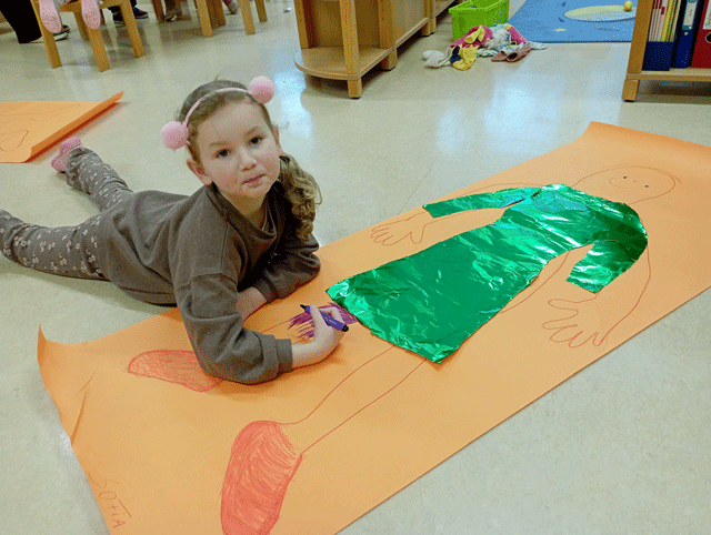 Unsere „Schneeweißchen und Rosenrot“– Gruppe hat sich in den letzten Wochen intensiv mit dem eigenen Körper beschäftigt. Dazu hat sich jedes Kind auf ein großen Blatt Papier gelegt und der Körper wurde umrandet. Im Anschluss haben sich die Kinder Kleidung gebastelt und diese auf den Körper geklebt.