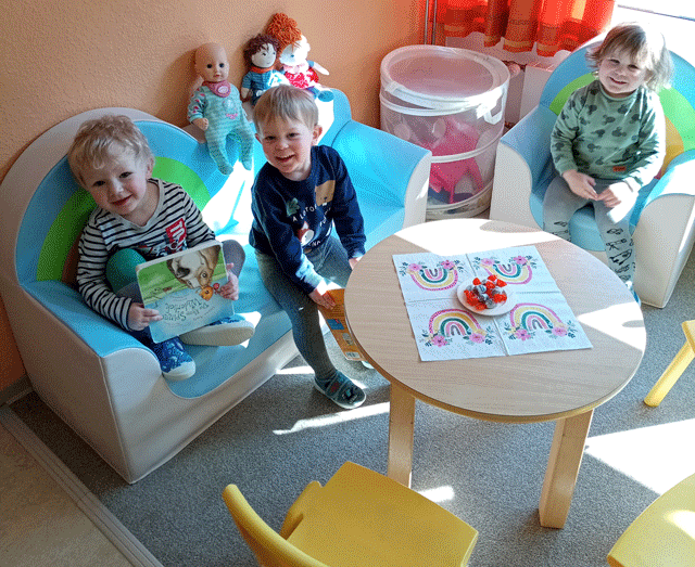 Unsere Krippengruppe „Die sieben Geißlein“ hat ein neues Sofa und einen Sessel bekommen. Die Kinder sind begeistert und haben die Möbel sofort eingeweiht. Sie fühlen sich pudelwohl!