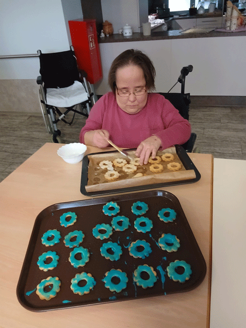 Nahezu alle unsere Pflegeeinrichtungen beteiligten sich im März an der Pflanzaktion „Vergiss?Mein!Nicht“. Dieser Tag soll zeigen, dass Menschen mit Demenz in unsere Mitte gehören, da auch sie Teil unserer Gesellschaft sind und nicht vergessen werden sollten! Kreativ waren die Bewohner*innen und das Team unseres Pflegeheimes für Menschen mit Behinderung „Haus Brunnenhof“ in Lengenfeld: Hier wurden Kekse in Vergissmeinnicht-Form gebacken und genüsslich verspeist.